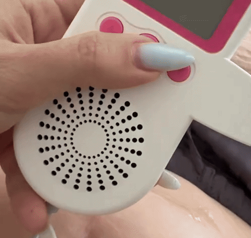 Placera försiktigt sonden mot huden och för den långsamt över magen. Inom kort hör du det välbekanta, rytmiska ljudet – ett litet hjärta som slår i takt med livet.